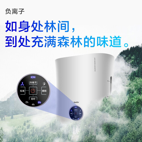 纳米无雾加湿,深层滋润干燥空气,身心更舒畅自然。并且还有定时负离子功能,净化空气,享受如森林般的清新自然感。
