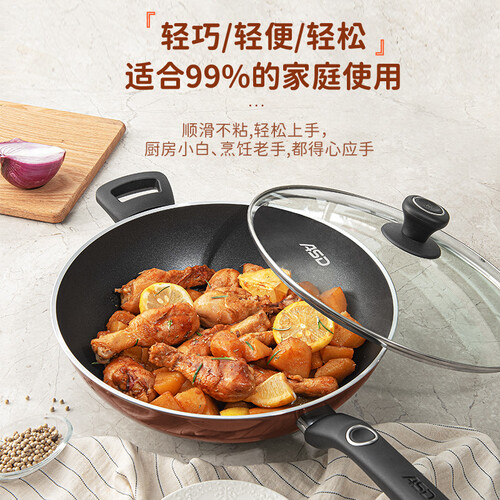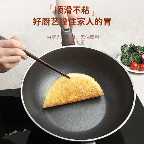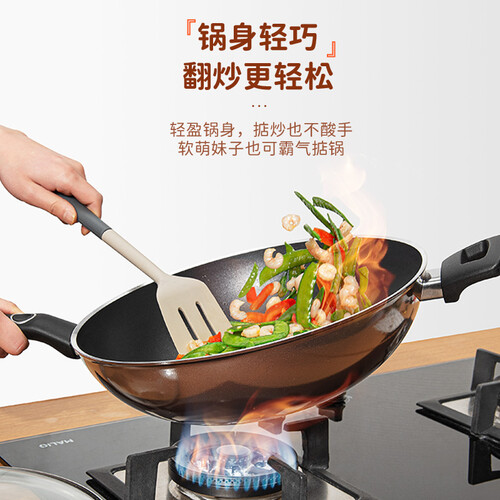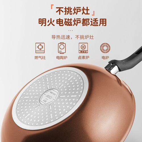 合金锅体厚底薄壁,热量均匀集中导热快受热均匀,炒菜少油烟;磁通锅底多种炉灶都能适用,锅身轻巧轻松掂锅。