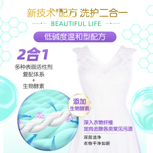 蕴含亲肤因子、椰油皂基、复合酵素、水软化因子等洁净护色成分,无需用力搓洗即可轻松去除衣物污垢,并留下沁人馨香。