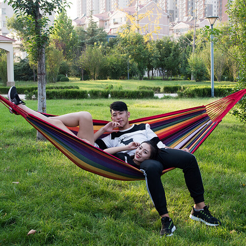吊床用的材质很好,躺两个人没问题双人的挺宽敞,带蚊帐的没有虫子,双人的挺宽敞,带蚊帐的没有虫子,在树林里好舒服。