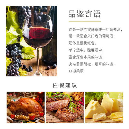 酒体呈樱桃红色,而且单宁适中,酸度适中,富含深色水果的味道。又经历八道工序精心制作而成,可带来柔顺口感。