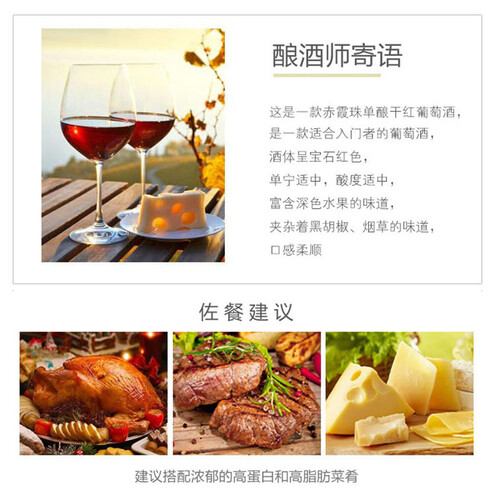 精致酒标图案,彰显你的尊贵品味。色泽颜色靓丽,口感十分的饱满,单宁柔和,入口顺滑。
