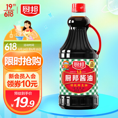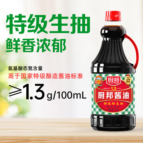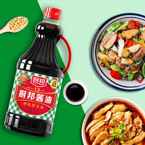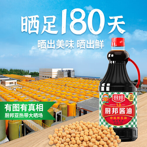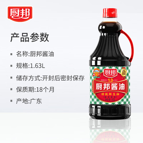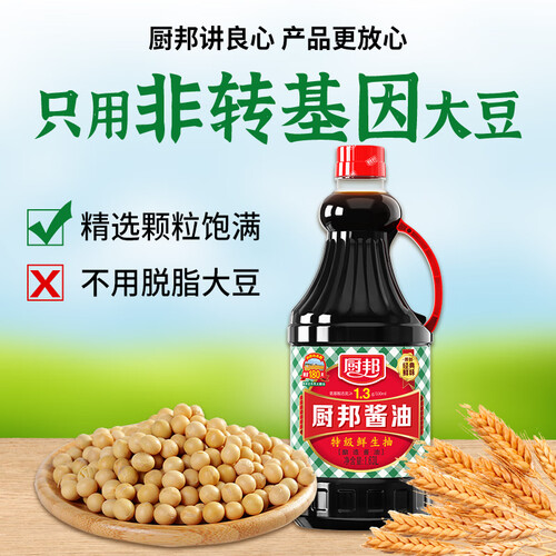 这款厨邦头道鲜美酿造酱油,采用小麦粉和东北非转基因大豆作为原料,发酵后酱油香气浓郁,味道醇厚。