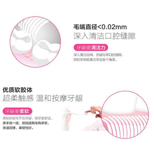 深入清洁齿间、牙龈沟等口腔缝隙,贴心守护每一颗牙齿的健康;选用优质软胶体,触感柔软舒适,温和按摩牙龈。