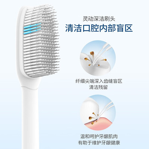 时尚防滑手柄,握感舒适,带来愉悦的使用体验;刷头刷毛一体成型,减少细菌滋生场所;细软刷毛,深入清洁牙龈沟。