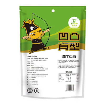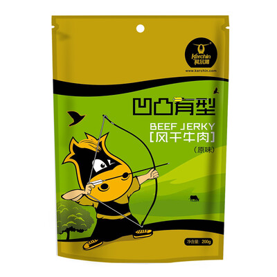 这是一款来自科尔沁休闲肉脯零食,选用了科尔沁的优质牛肉,它的每一块牛肉干至少会风干18小时,而且还会进行高温杀菌。