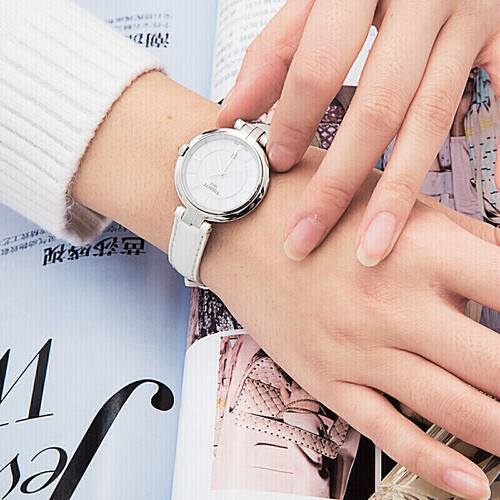 这款手表采用了蓝宝石的水晶玻璃表镜,具有强硬度特点,不易损坏,读数清晰。同时洁白的表带,适合女性佩戴。