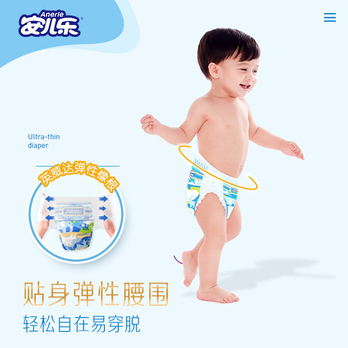 这款安儿乐加厚吸水婴儿拉拉裤,采用贴身弹性腰围设计,贴合宝宝身型,不会伤害娇嫩皮肤,有效防止测漏。