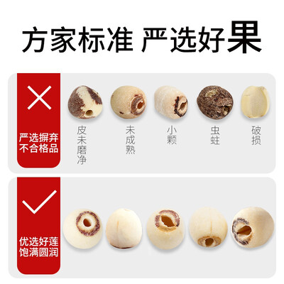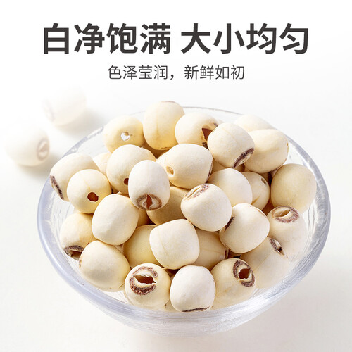 每颗莲子经人工挑拣,去劣存优,确保莲子的质量。莲子颗粒饱满,洁白圆润,煮熟后莲香四溢,入口香甜酥软,吃完齿颊留香。