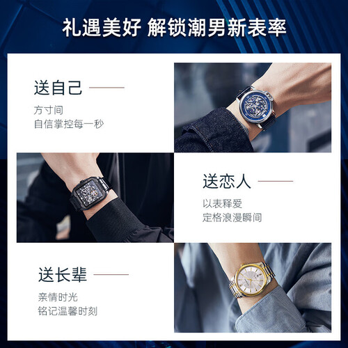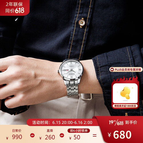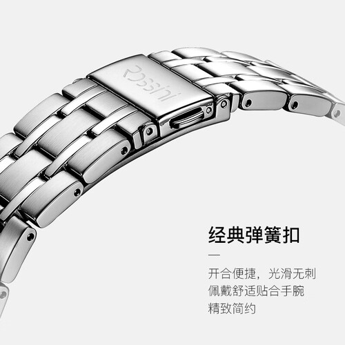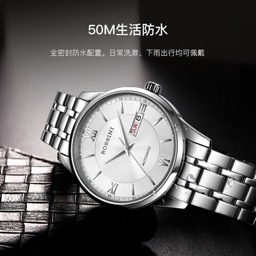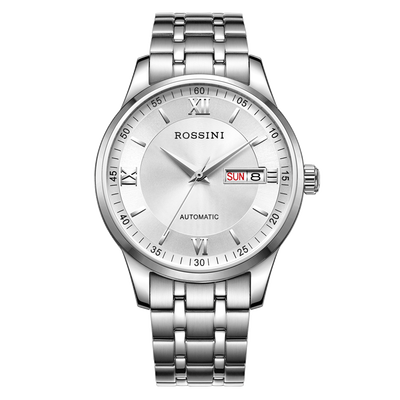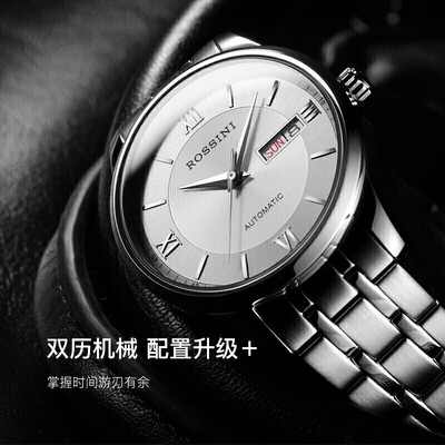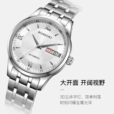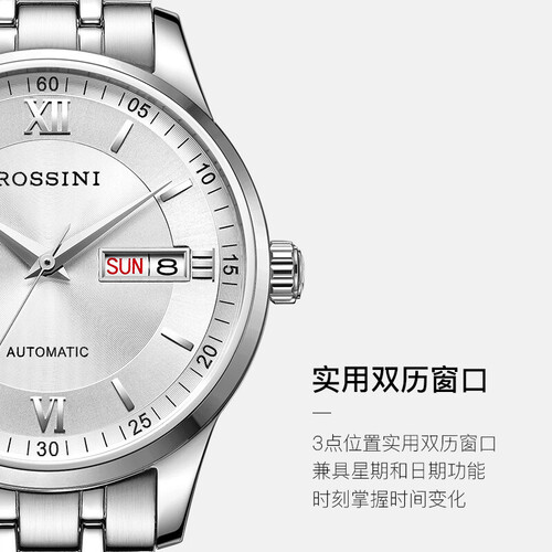 大开面表盘,让视野更开阔,配以3D立体字钉和剑形阔针,简洁大气。双历显示,读取日期更容易。采用粗齿文把的,美观又实用。