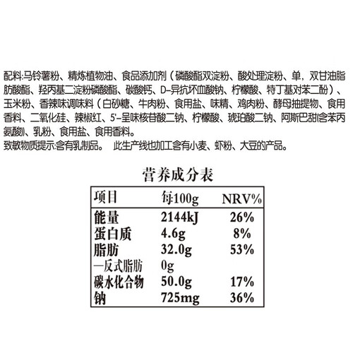 用心选取优质土豆与精粹植物油,加上精制调料,制成鲜香美味的薯片。薯片香脆劲薄,清新美味,香辣可口。