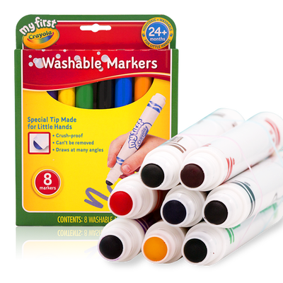 圆型嵌入式笔头,适合低幼儿握笔绘画,笔尖圆钝不会伤到宝宝肌肤,触点均匀,绘画线条流畅,笔身材料可回收,绿色环保。