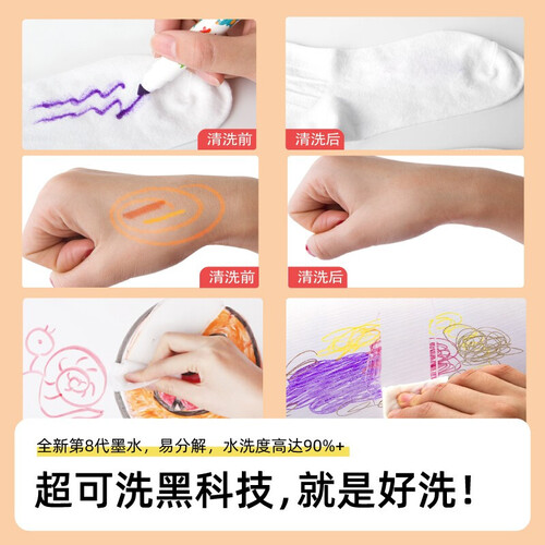 大笔头耐压不易缩,延长了水彩笔的使用寿命,笔尖和侧峰能画出不同粗细的笔迹,笔杆直径1.5cm容易抓握,涂色流畅。