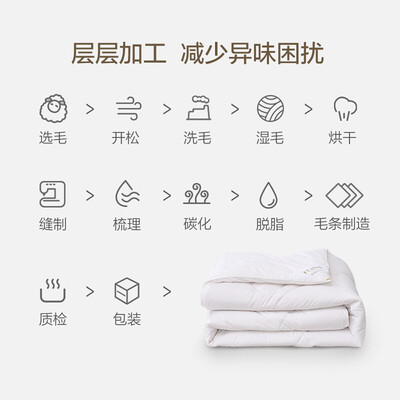 采用先进的炭化加工工艺,有效地去除了羊毛的异味,保障了被子的卫生洁净。表层密布细密的绒毛,柔和亲肤。