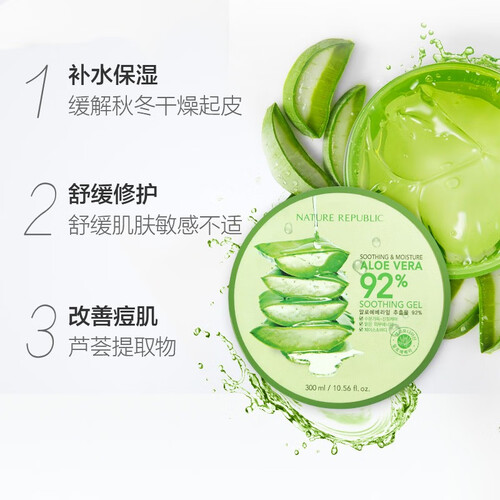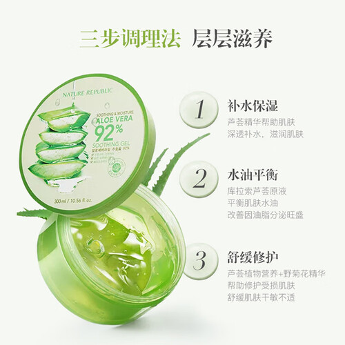 富含芦荟精华,轻柔温和,日常补水和晒后修复皆可;凝胶质地,水润轻薄不油腻,做全身护理,可使肌肤变得光滑有弹性。