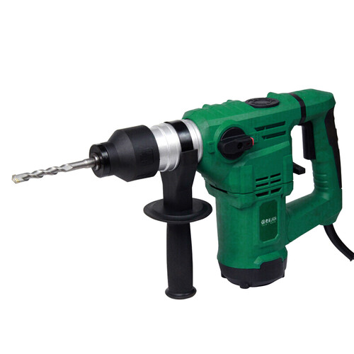 大功率电锤能够快速钻孔,钻头卡住时,离合器自动打滑保护电机,齿轮用工具钢制造,热处理,咬合紧,有效传动。