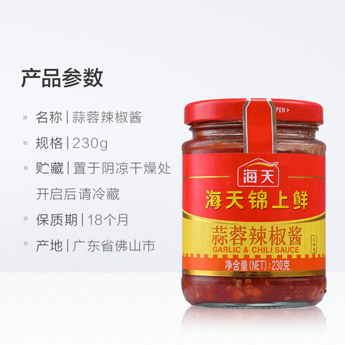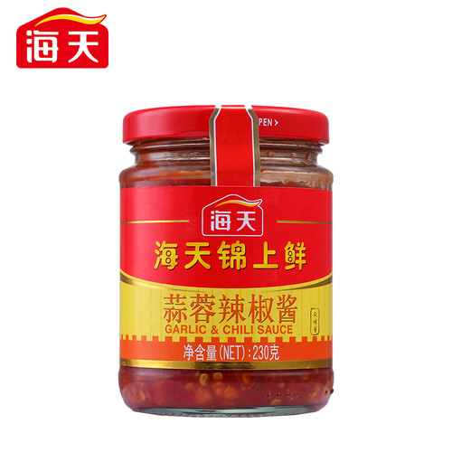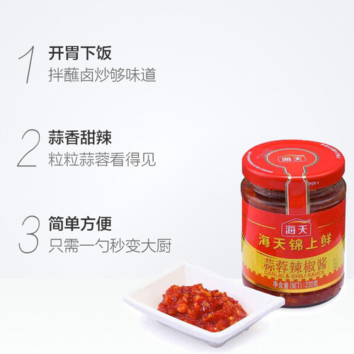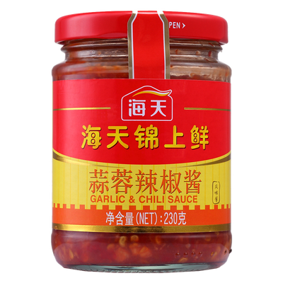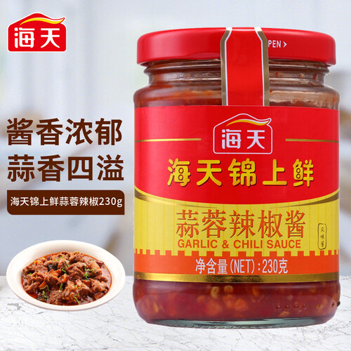 海天辣椒酱精选饱满红辣椒等原料,经过多道工艺制作而成,鲜辣可口,酱香浓郁,蒜香挡不住,回味无穷。