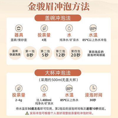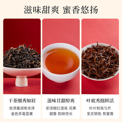 甄选武夷山生态茶园,采摘春茶芽为原料,经过传统工艺精制,干茶条索紧秀,呈黑黄褐三色相间,冲泡后汤色金黄,醇厚甘甜。