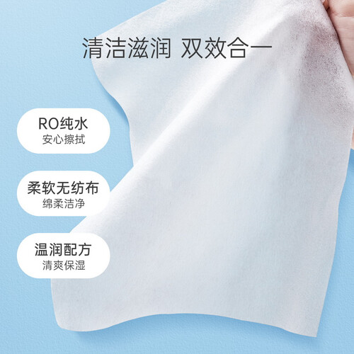 湿巾采用水刺无纺布制作,质地绵柔亲肤,添加维生素E成分,在温和清洁肌肤的同时,给肌肤增添水润光泽。