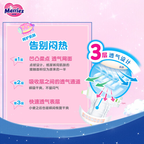 内部添加柔软大空气垫,可快速吸收尿液,保持宝宝屁股干燥。添加三层透气设计,可有效排出湿气,呵护宝宝娇嫩肌肤。