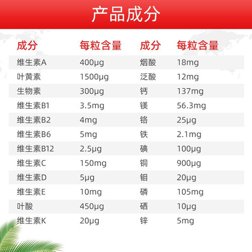 富含10种维生素和12种矿物质,还添加了叶黄素和生物素,多方位满足人体所需。使用肠溶缓释技术,营养更易吸收。