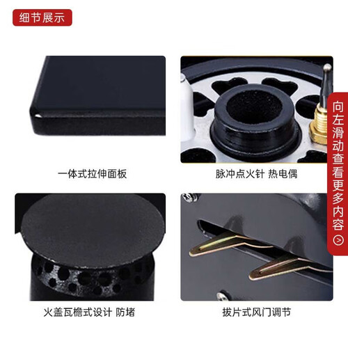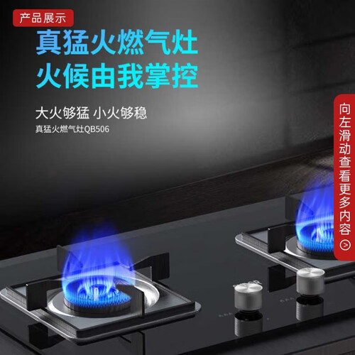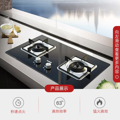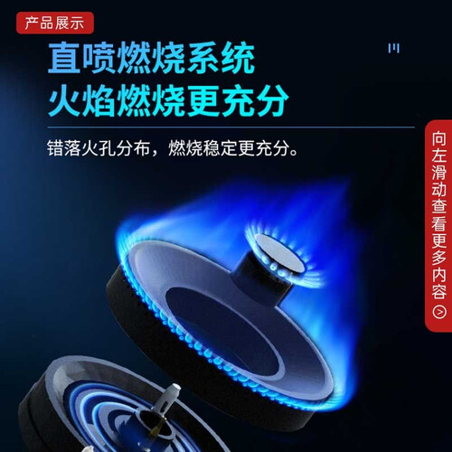 持久高能蓝焰,燃气利用率高,从小火慢炖到猛火爆炒,美味随心掌控,黑晶钢化玻璃镜面面板,美观大气,百搭多种厨房风格。