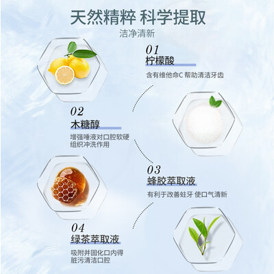 天然植物萃取精华,可以有效改善口腔问题。茶叶可以吸附并固化口腔内的脏污,预防口臭。蜂胶成分滋养牙龈,预防炎症。