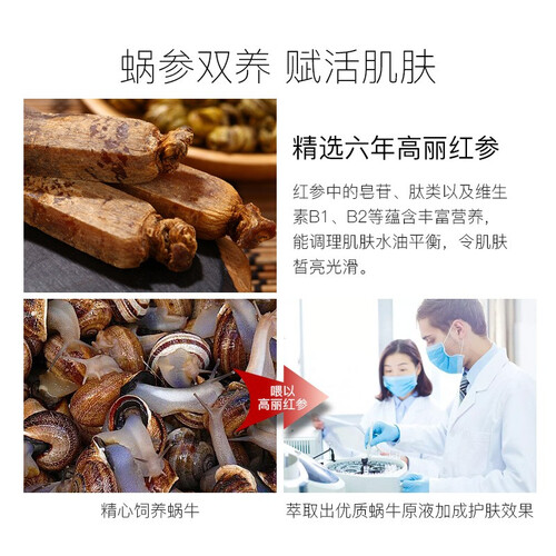 红参提取物有效提升肌肤弹性,隐匿肌肤细纹。添加蜗牛粘液,蕴含天然软骨素,可强化肌肤保湿力。