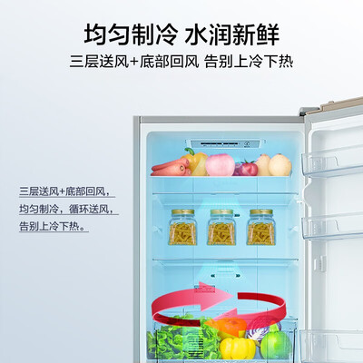 采用风冷无霜设计,均匀制冷循环送风,食材保鲜更安全。多功能果蔬盒自由放置,通过拨片左右调节,分放食材更方便。