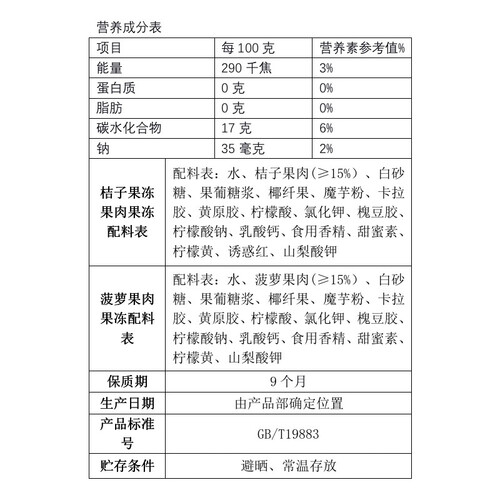 橘子菠萝组合味果冻,两种口味带给你不一样的风味和浪漫。超过15%的果肉含量,让你甚至可以吃到果肉粒,果香四溢。