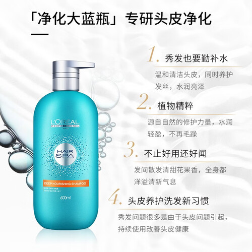 采用多种植物精粹,以天然成分自然修复,发根更强健,睡莲提取物添加,具有补水净化作用,一瓶轻松实现洗护二和一。