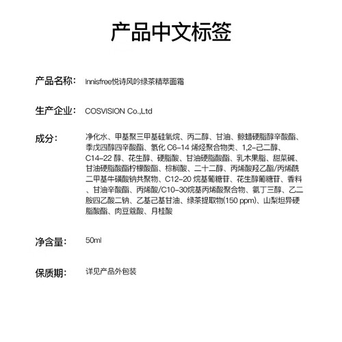 奶油质地,涂抹之后易于推开,带来长时的保湿。添加新鲜的绿茶水,帮助呵护肌肤,调节水油平衡。
