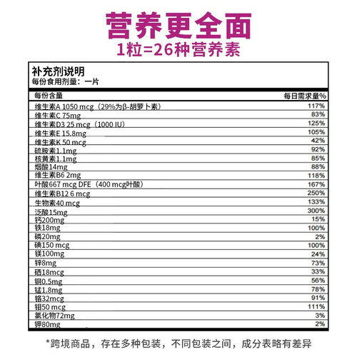 富含26种维生素和矿物质。专为女性量身定制,多重协同配比,释放多倍能量,促进人体细胞新陈代谢,满足女性身体所需。