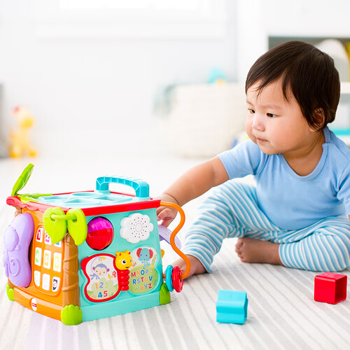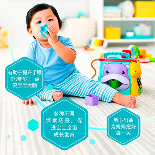 费雪这款多功能探索学习六面盒,通过颜色、数字、音乐、图形等,帮助宝宝提升认知能力。眼手并用,培养宝宝的协调性。