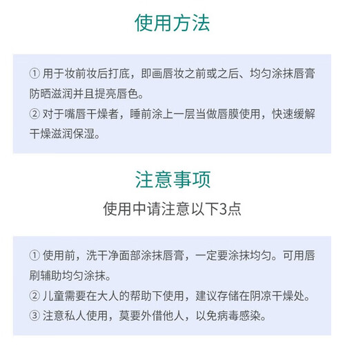 采用水润型成分,使用起来更舒爽。采用防干裂成分,可以更好的改善唇部的唇纹,使润唇膏有更好的滋润保湿性。