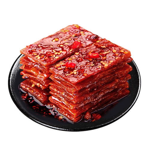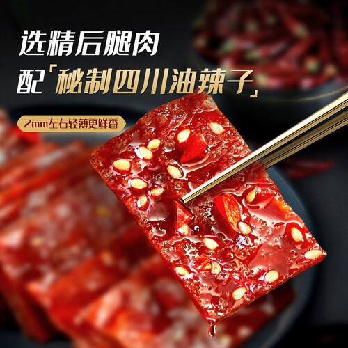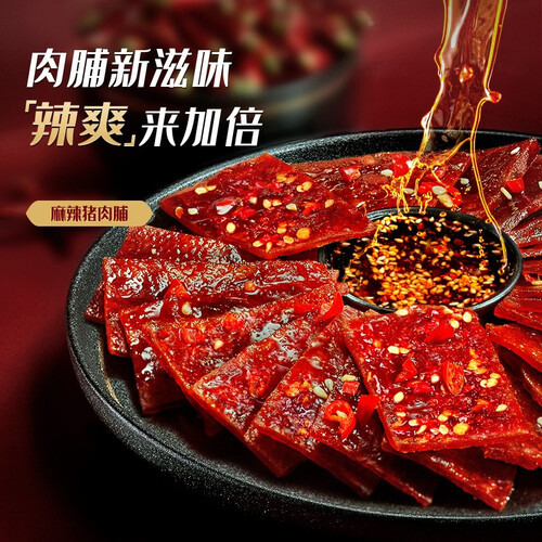 选材来源于猪筋膜较少的后腿,添加八角等香料与独家辣椒酱,鲜辣爽口。慢火轻烘保证肉质完整不被破坏,留下浓郁麻辣风味。