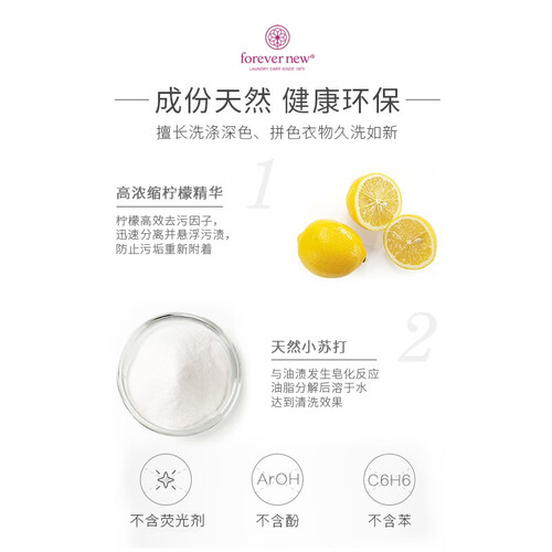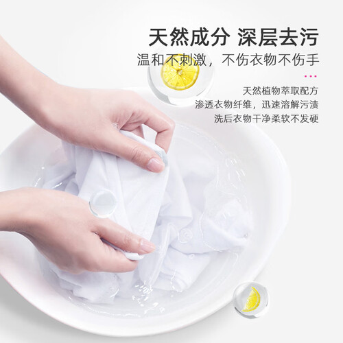 富含柠檬精华,洁净力强,可去除各种衣物污垢。加入独特的固色护色因子,清洗时不易掉色,确保衣物光亮如新。