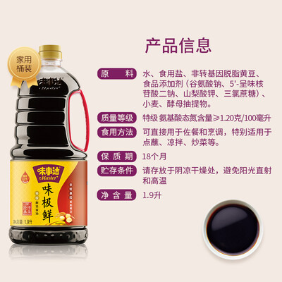 采用1.9L容量包装,能够更好满足长时间使用需求。经过高温蒸煮,使酱油中的香味和营养能够均匀融合,更加美味健康。