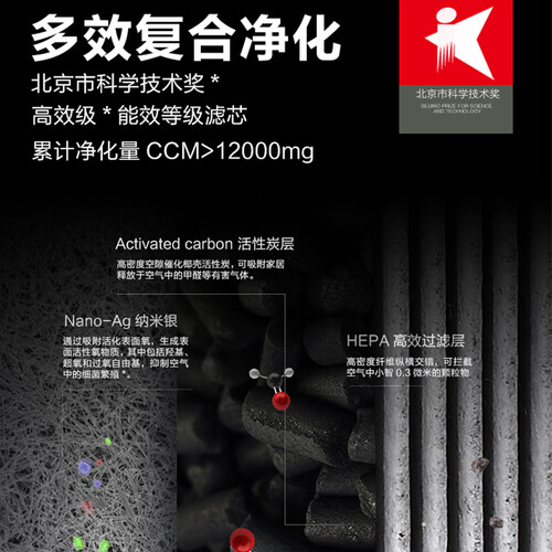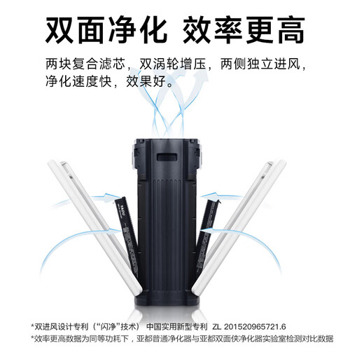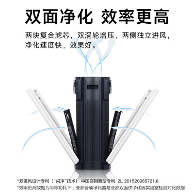 能实现多效净化,有效去除甲醛、臭氧、二氧化硫等五种污染物;8分钟即可将25㎡的大空间空气焕然一新,机身灵巧不占地。