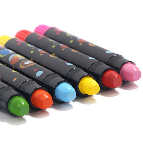 选取天然原料,环保亲肤;笔芯中间增加了气孔的设计,防止意外吞咽卡喉;子弹型的笔头设计,更易涂色。