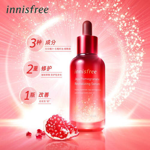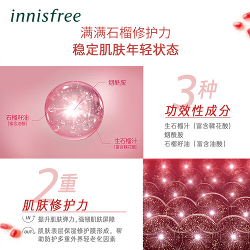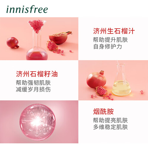 济州生石榴汁提升肌肤自身呵护力,石榴籽油强韧肌肤减缓岁月损伤,烟酰胺提亮肤色多维稳定肌肤,密集修护,肌肤水润亮泽。