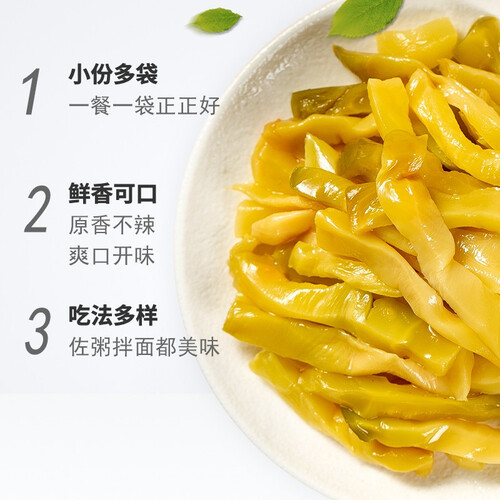 长榨菜条色泽金黄,咸香浓郁,让人食指大动。咸淡适中,口感爽脆,鲜嫩无筋,咬一口嘎嘣脆,配米饭或是粥都不错。