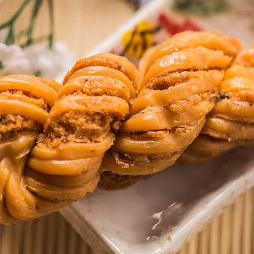 这款麻花可是地道的天津风味,油亮润泽的外表,带来阵阵浓郁香气,夹着经典五仁馅料,酥脆的口感,更是令人拍案叫绝。