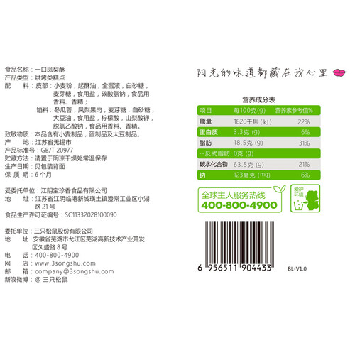 新鲜凤梨、优质麦粉,经过合理比例制作。外层饼皮香酥纤薄,内馅凤梨馥郁软糯,结合小麦的松软细腻,口感清爽,层次丰富。