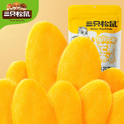 三只松鼠芒果干由东南亚鲜芒果加工制作,自然甜度高,果肉鲜润饱满,易嚼不发硬,片片都是鲜果风味。