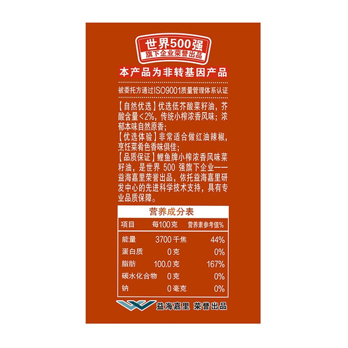 精选四川非转基因菜籽原料;适度加工,锁住地道菜油香,传承四川小榨工艺之精髓,非常适合做红油辣子,更入选国家品牌计划。