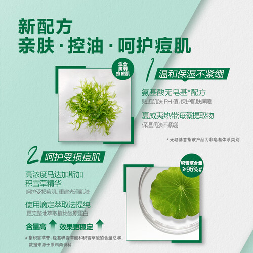 温和洁净,角质层不易变得脆弱,小心呵护您的柔嫩肌肤。控油效果好,洁面后脸部更干爽,不易出油。积雪草精华成分,可淡化痘印。