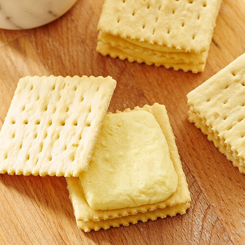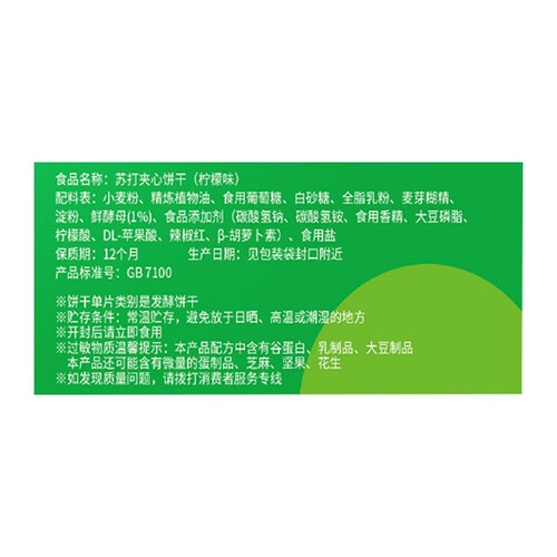 3层的苏打饼干,中间夹两层奶油,淡淡的柠檬味,不甜不腻,分量足,容易消化吸收。独立真空包装,便于携带,开袋即食。