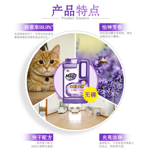 添加表面活性剂,具有更强的洁净力,能够去除多种顽固污渍。蕴含薰衣草香氛,带有清新怡人的香气,能够去除房间中的异味。