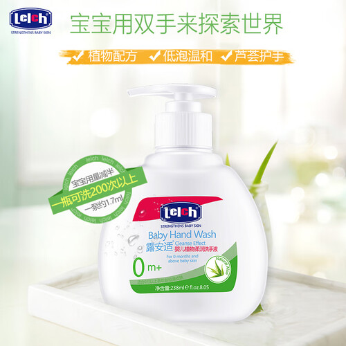 质地温和,含天然芦荟精华,0月以上的宝宝也适用。不添加色素等,气味自然清新,宝宝洗手不抗拒。